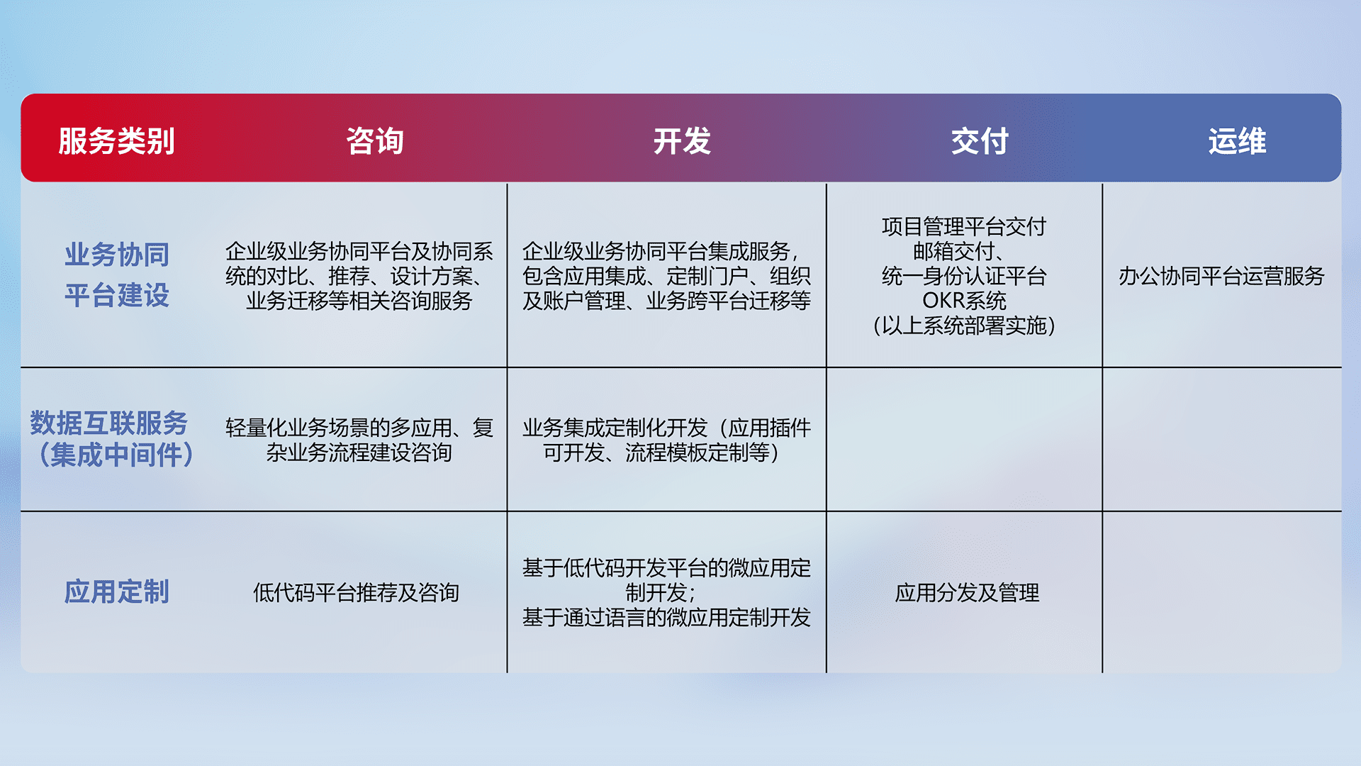 针对钉钉、、企微、、、、IDaas等平台级产品提供产品的规划、、方案、、交付、、、定制化开发等服务,,,,实现如统一协同办公、、、智能客户服务、、混合会议管理、、、、智能数据查询、、、等业务场景,,,,实现数字化转型。。