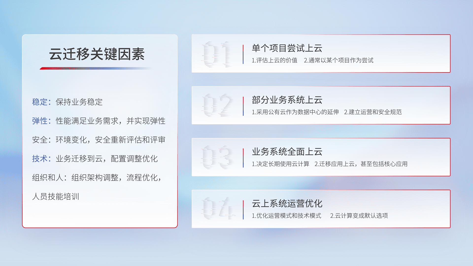 结合实际业务,,从规划设计、、云平台选型、、、云原生改造、、数据迁移、、集成交付,,,迁移全过程为客户识别最佳上云路径,,,做好风险识别管理,,,设计网络架构、、身份权限、、、安全审计合规、、、、操作审计、、、、日志审计、、、、监控告警策略、、、多站点容灾设计等,,对云上基础设施进行整体规划,,,提升IT治理水平,,,,以满足弹性、、、高可用、、、、高性能的需求。。