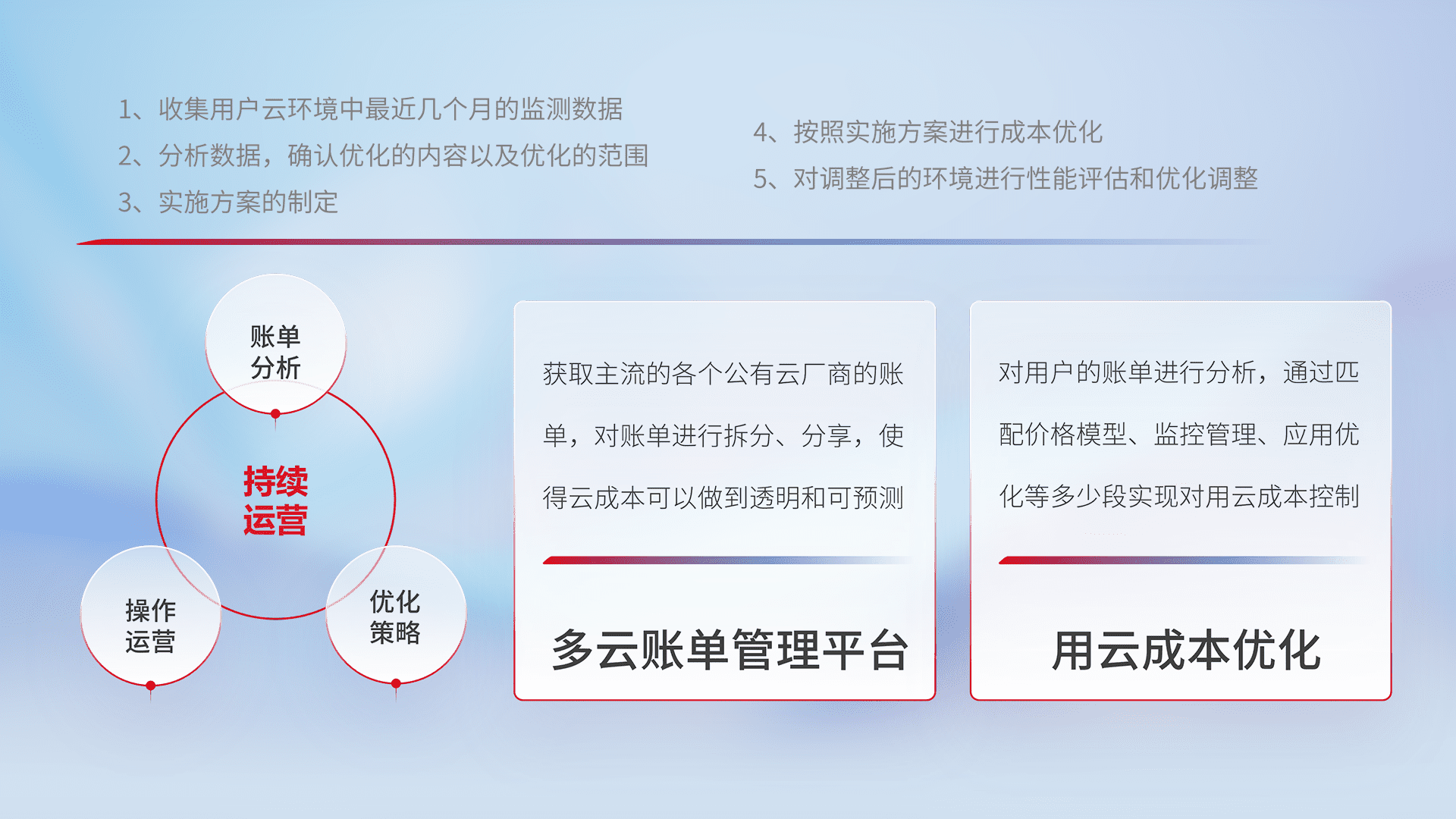 通过多云纳管,,以统一的资源数据模型把客户的云资源进行抽象和封装,,,,进而实现对多云资源的统一操作,,,,保障云资源管理的可靠性、、、、稳定性与可用性。。。量身定制化运维内容,,配置、、、、开发运维、、、、补丁管理、、备份、、、、监控、、、、认证和访问管理、、、、审计和日常巡检等,,,,保障在用云过程中的可靠度,,稳定度以及高可用率。。。。